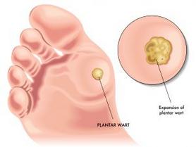 Plantar warts are a form of Human Papilloma Virus (HPV). Plantar means the bottom of the foot. The skin on the bottom of the foot is quite thick making warts that occur there more challenging to treat compared to warts on other parts of the body. The wart virus can enter the foot through tiny cuts or cracks in the skin. The Human Papilloma Virus thrives in warm and moist environments such as bathroom floors, pools and other swimming areas. Plantar warts are very contagious and can easily spread to other areas of the feet and to other family members. [plantar wart]